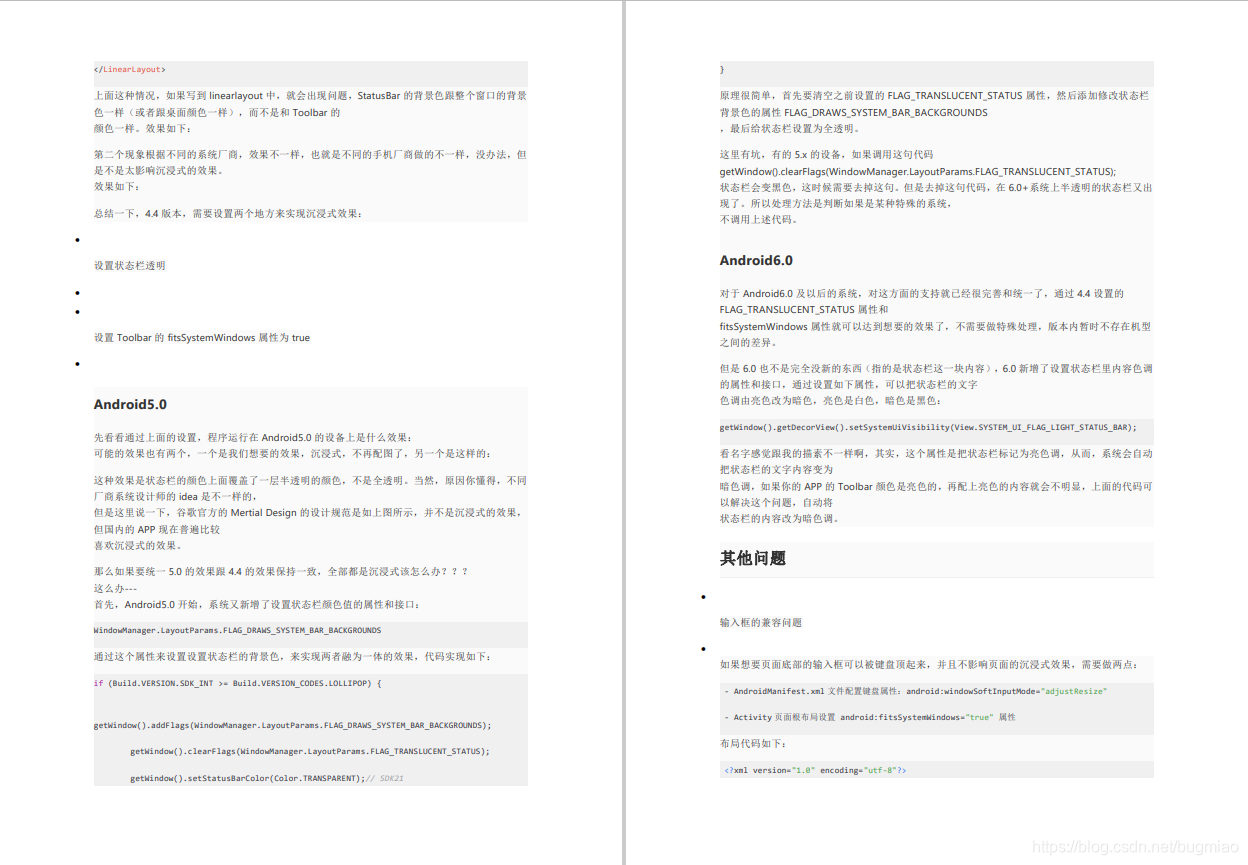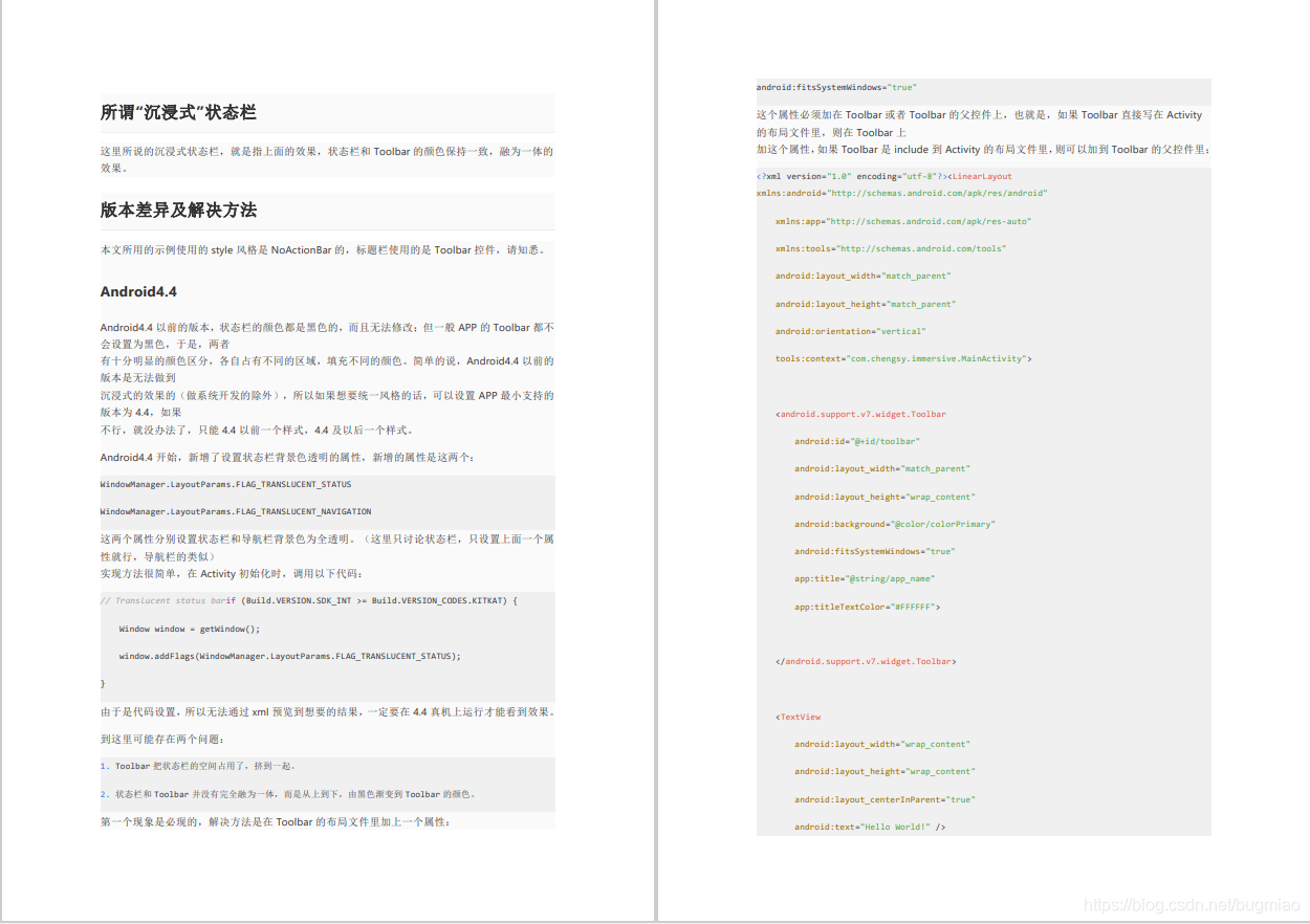 简单的说,Android4.4以前的版本是无法做到沉浸式的效果的(做系统开发的除外),所以如果想要统一风格的话,可以设置APP最小支持的版本为4.4,如果不行,就没办法了,只能4.4以前一个样式,4.4及以后一个样式。 Android4.4开始,新增了设置状态栏背景色透明的属性,新增的属性是这两个:WindowManager.LayoutParams.FLAG_TRANSLUCENT_STATUSWindowManager.LayoutParams.FLAG_TRANSLUCENT_NAVIGATION